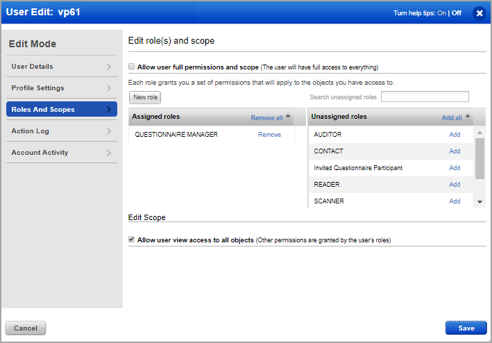 In case you want to grant an existing VM/VMDR user the Questionnaire Manager role, just go to the user's settings in Administration utility and grant the role. |